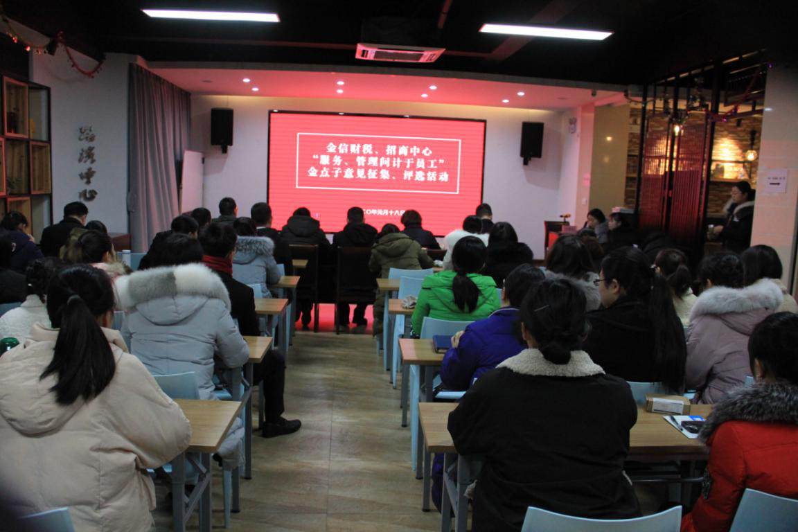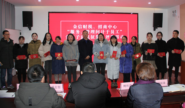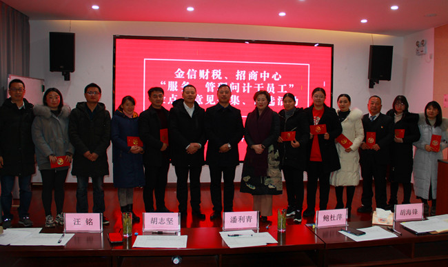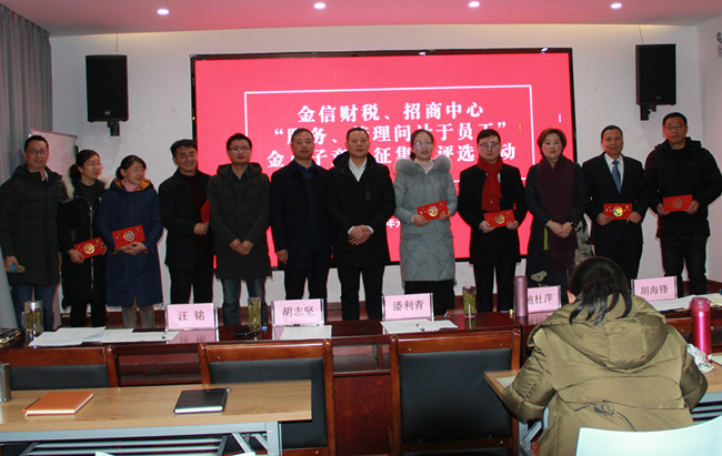 1月18日,招商中心、金信財稅召開“金點子”評選大會,并專門聘請縣經(jīng)濟(jì)開發(fā)區(qū)副主任潘利青、縣投資促進(jìn)局副局長鮑杜萍、縣科技商務(wù)經(jīng)濟(jì)信息化局副局長胡志堅等三位領(lǐng)導(dǎo)作為評委參與評選,金信財稅全體員工50余人參加了大會。