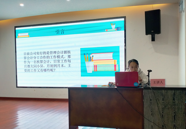 吳瑩瑩會計工作認真、鉆研業(yè)務(wù),她結(jié)合自己日常的核算工作中積累的經(jīng)驗,從抄稅報稅、票據(jù)審核、發(fā)票認證、發(fā)票開具、納稅申報等幾個方面分別向大家講解了需要注意的事項,并將自己所學(xué)到的工作技巧和簡便方法一同分享給參與人員。經(jīng)過吳瑩瑩的講解,參與分享的人員對“核算會計”的日常工作事項有了更深入、全面的認識,有助于更好的為企業(yè)做好服務(wù)。