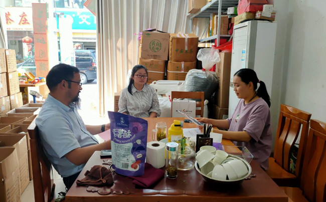 [上圖為胡曉紅副經(jīng)理與會(huì)計(jì)方智敏在與黃山市歙縣仰坦精制花茶廠(chǎng)經(jīng)理江健進(jìn)行面對(duì)面溝通交流。]