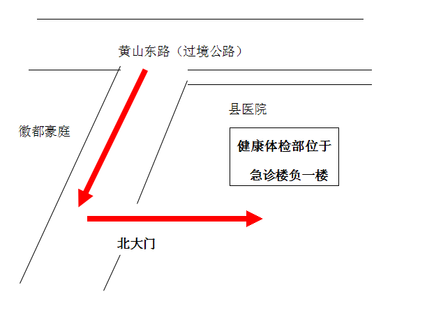 一、健康體檢部位置(線路1:不要上醫(yī)院平臺,沿著縣醫(yī)院與徽都豪庭之間的主干道直行300米左轉(zhuǎn),從北大門進入縣醫(yī)院,直行40米到達健康體檢部;線路2:上醫(yī)院平臺,從一樓門診大廳,沿樓梯下到負一樓健康體檢部。)